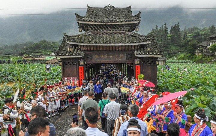 2025年6月28日,在广西三江侗族自治县良口乡和里村的侗族文化长廊前,村民吹奏芦笙欢迎游客。新华社记者 张爱林 摄