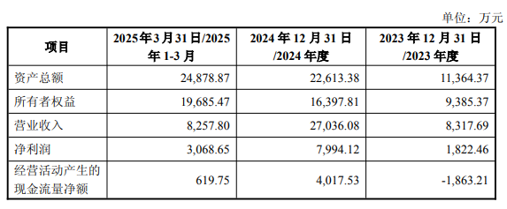 标的公司2023年度、2024年度以及2025年一季度的营业收入分别为8317.69万元、27036.08万元、8257.80万元,净利润分别为1822.46万元、7994.12万元、3068.65万元,经营活动产生的现金流量净额-1863.21万元、4017.53万元、619.75万元。最近两年一期未经审计的主要财务数据如下: